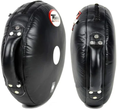 The Twins round punch pad/cushion/shield is designed to make it easier for coaches to work with boxers on their mobility with different kinds of punches. Thick padding to absorb heavy shots. Made from the highest quality solid black Thai leather.