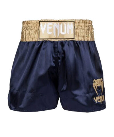 Muay Thai shorts you can turn to again and again: Venum Classic Muay Thai shorts are must-haves for Muay Thai practitioners.Made in Thailand, these Thai boxing shorts have been made with a light and flexible polyester, to leave you free to move. Side slits allow for greater range of motion in the ring.Meanwhile, a wide traditional belt offers a secure supportive fit around the waist, so you can focus on your performance.These Muay Thai Classic shorts in navy blue-gold have a sleek design, with neat finishes and the unmistakable Venum logo at the waist and leg in gold.Expert Tip: We recommend choosing one size up for a “tailored” fit or two sizes up for a looser fit. Please see the size guide for specific measurements of these authentic Thai made shorts.