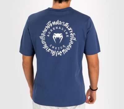 The Venum Strikeland T-Shirt in navy blue features the Venum snakehead logo in greige at the chest. Across the back, Thai script encircles both the Venum logo and the phrase “Adrenaline Inside” – a reminder of the strength, agility and adrenaline this sport demands of Nak Muay.